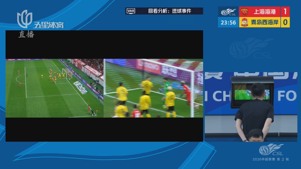 第22分钟,上海海港通过角球打入一球,李帅罚向前点被解围后,莱昂纳多在后点补射得手。但主裁判经VAR裁判提示后亲自察看回放,示意海港外援让·克劳德冲撞门将在先,进球无效。