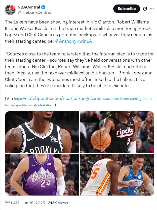 北京时间6月18日,湖人队记安东尼-劳瑞恩透露,湖人队在交易市场上盯上三位首发中锋,在自由市场上盯上两位合格的替补中锋,首发中锋人选是尼克-克拉克斯顿、沃克-凯斯勒、罗伯特-威廉姆斯,替补中锋人选是克林特-卡佩拉、布鲁克-洛佩斯。