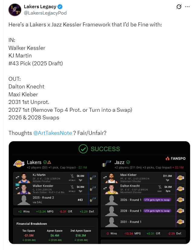 第三套方案是湖媒Lakers Legacy模拟,湖人得到:凯斯勒、小马丁、2025年43号签;